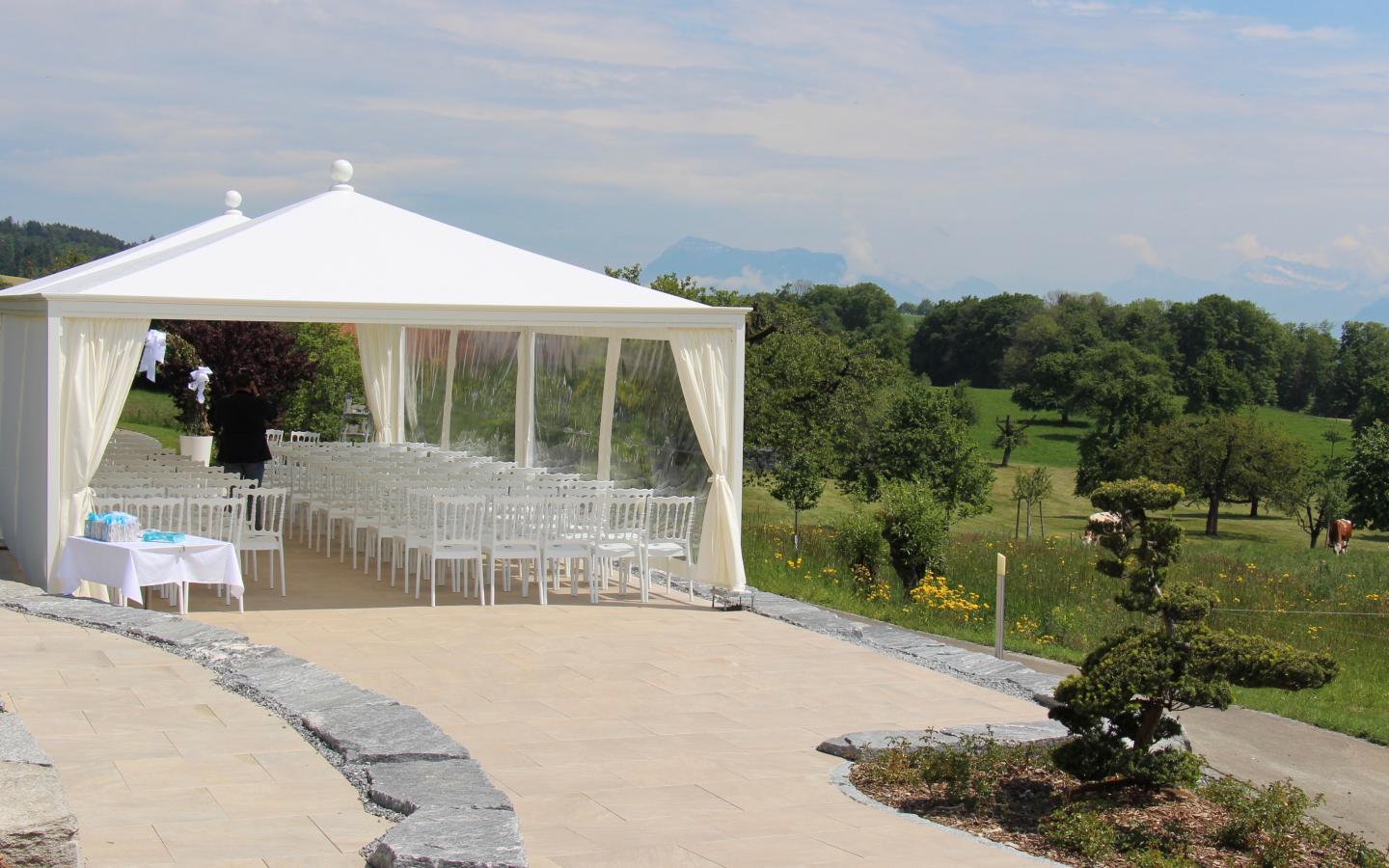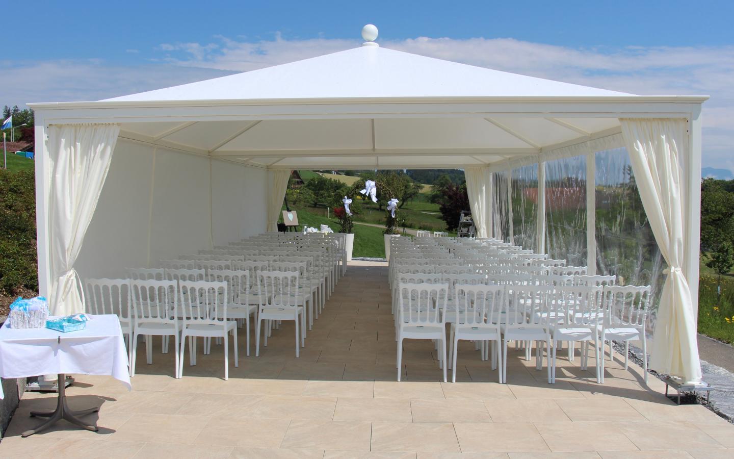 Unser Hochzeits – Pavillon ist ideal für eine freie Trauung oder eine Hochzeits - Zeremonie. Geniessen Sie romantische und unvergessliche Momente bei Ihrer Feier unter freiem Himmel. Der Pavillon bietet eine traumhafte Aussicht und Raum für 100 Sitzplätze bei jedem Wetter.
