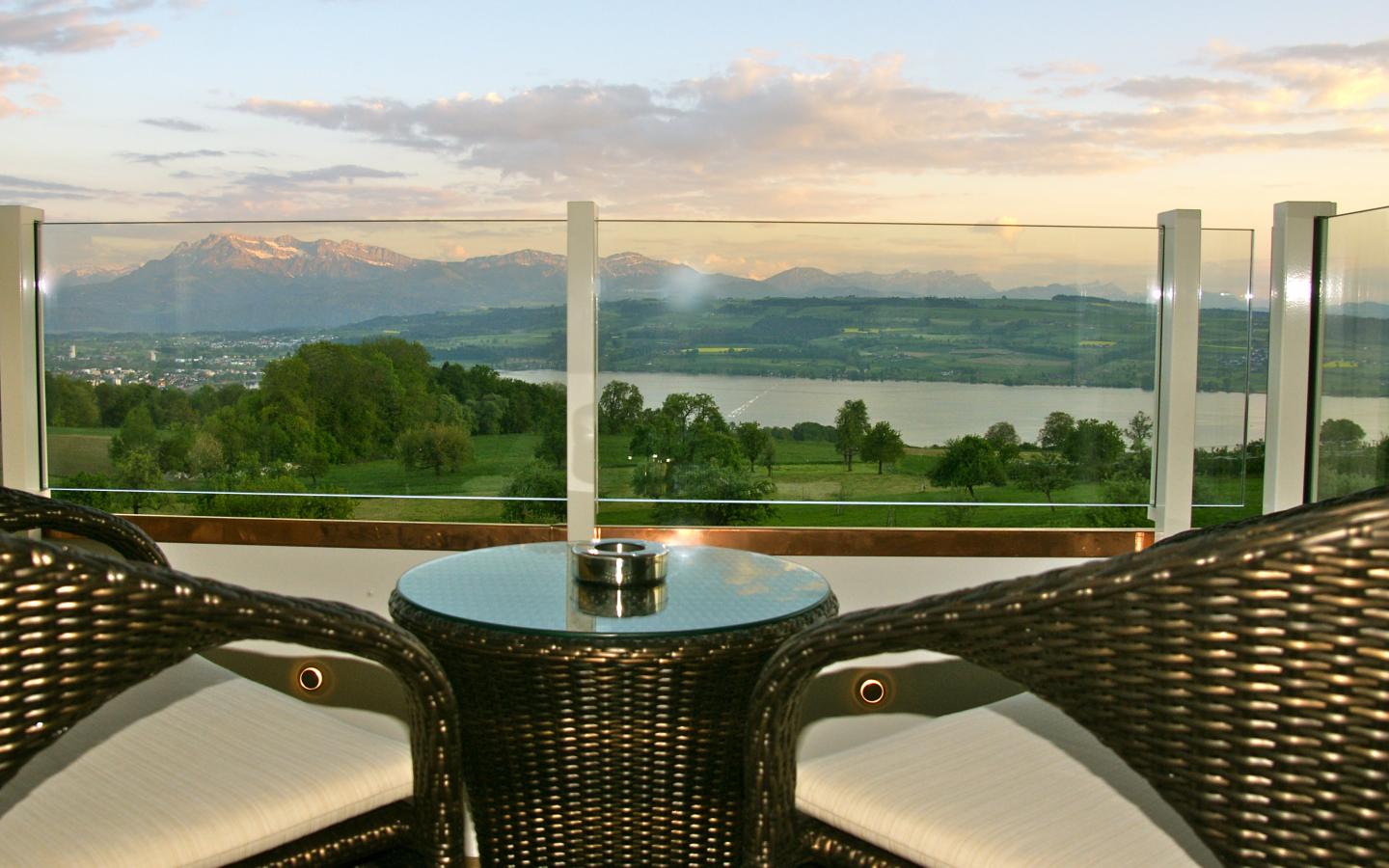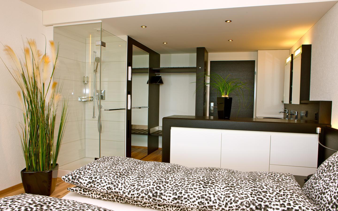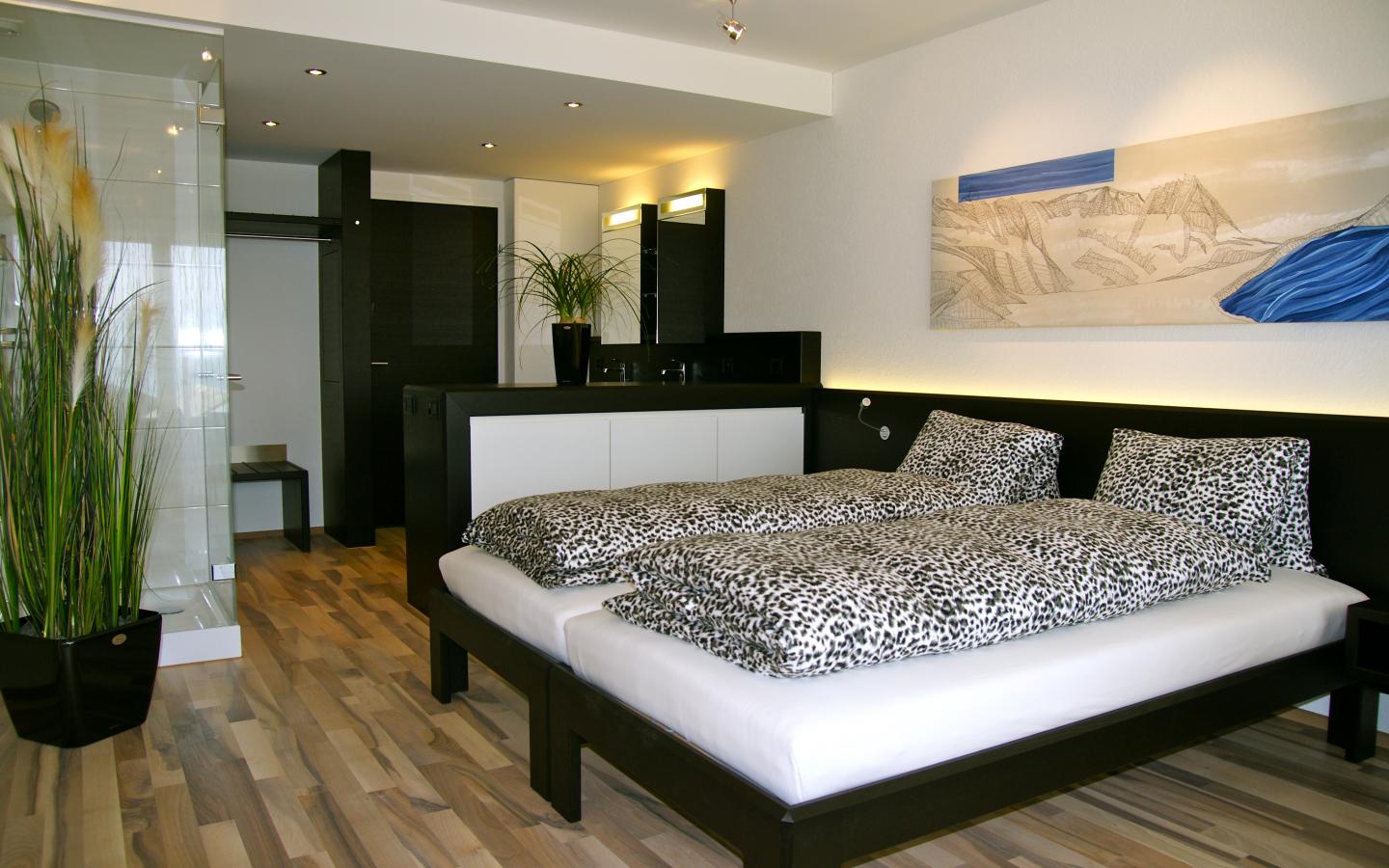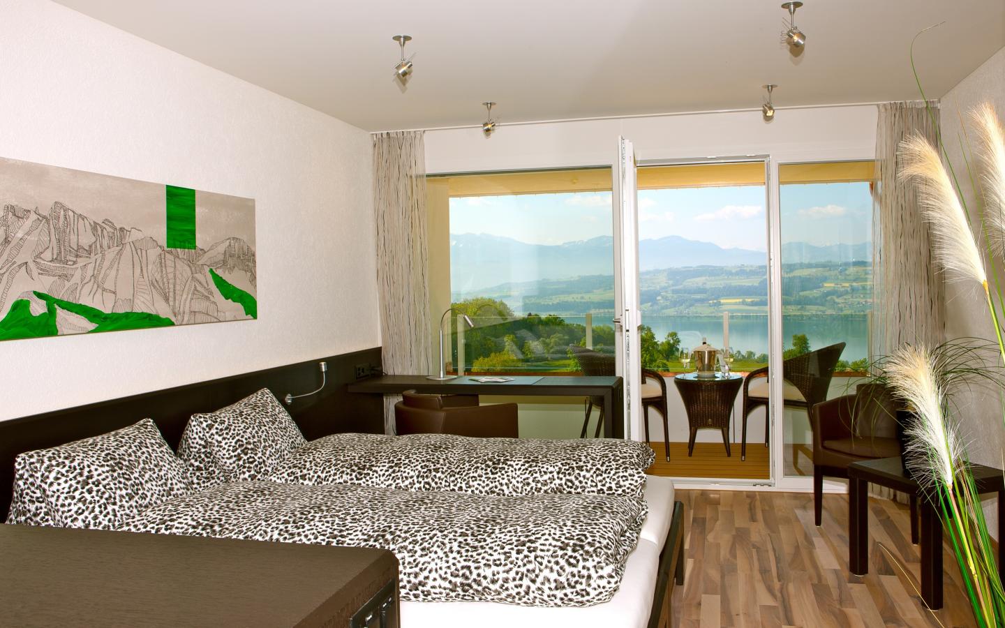 Modernes Doppelzimmer im Loft-Design mit Balkon zur Seeseite. Alle Doppelzimmer sowie Bäder sind mit einem Schweizer Nussbaum-Parkett versehen. Die Original-Bilder der Alpen von Irene Burkhard Müller und Karin Baeriswil verleihen jedem Zimmer einen eigenen Charakter.