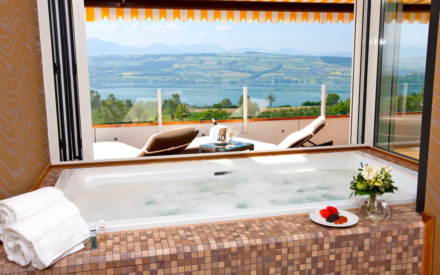 Verwöhnen Sie sich in der grossen Wellness-Badewanne mit Aussicht und lassen Sie die Seele baumeln.