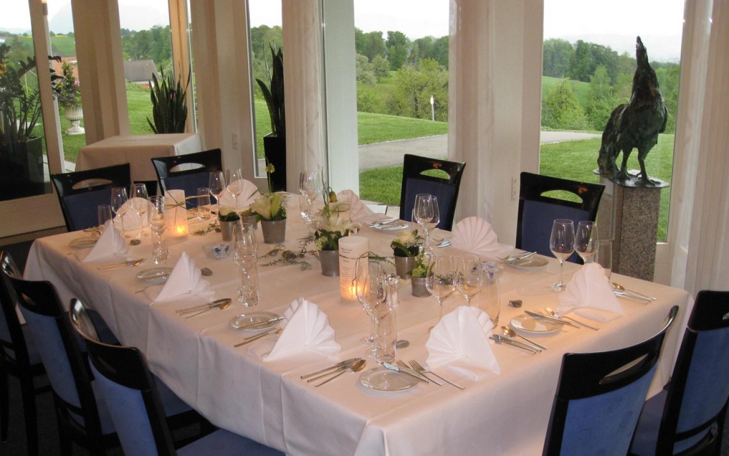Unser A-la-carte Restaurant im Wintergarten mit Blick auf die Alpen und den Sempachersee bietet ein stilvolles Ambiente bei Kerzenlicht! Dieser Raum ist Ideal für Familienfeste und Hochzeiten bis zu 55 Personen oder auch für ein Mittag- oder Abendessen zu Zweit.
